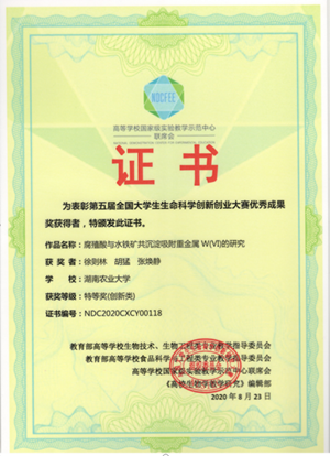本网讯(周俊海 徐则林)近日,第五届全国大学生生命科学创新创业竞赛落下帷幕,由我校资源环境学院铁柏清教授、杜辉辉副教授指导,本科生徐则林、胡猛、张焕静为主要团队成员完成的创新组参赛作品“腐殖酸与水铁矿共沉淀吸附重金属W(VI)的研究”荣获特等奖。