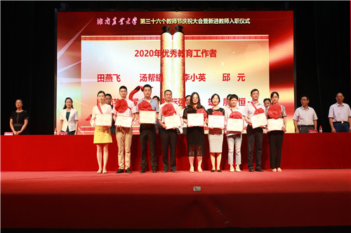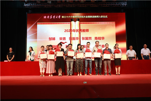 本网讯(宣传部 庹炼)9月10日上午,学校第三十六个教师节庆祝大会暨新进教师入职仪式在大礼堂举行。全体校领导为2020年度优秀教育工作者、2020年度优秀辅导员、2020年度优秀教师、第一届青年教师标兵获得者颁奖,代表学校党委、行政向全校广大教师和教育工作者致以节日问候和崇高敬意,勉励全体教师围绕立德树人、强农兴农,努力追求一流农业大学目标,在全省农业现代化中发挥更大作用,为建设富饶美丽幸福新湖南作出新贡献。