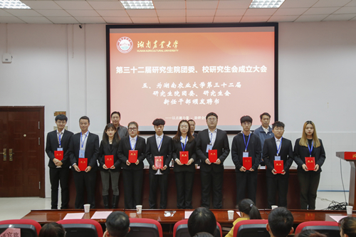 彭湘奇宣读《关于成立湖南农业大学第三十二届研究生院团委、研究生会的通知》,封蓉、龙俊佑等89名同学被聘为第三十二届研究生院团委、校研究生会干部。
