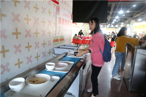 在东湖食堂三楼打造的智慧餐厅,启动了“智能称重、无感支付”就餐系统。当菜品从盛菜器皿中被舀出后,机器会根据减少的菜量自动计算出费用,哪怕只想要几毛钱的量也是可行的。通过该系统,同学们可按喜好自助选菜,真正实现了“喜欢的菜多打,只想试试味道的菜就少打,想吃多少打多少,全凭自己掌握”。这种智能用餐的新模式,不仅给予了同学们现代化、便利化的用餐体验,而且通过按需取餐,有效避免了浪费。