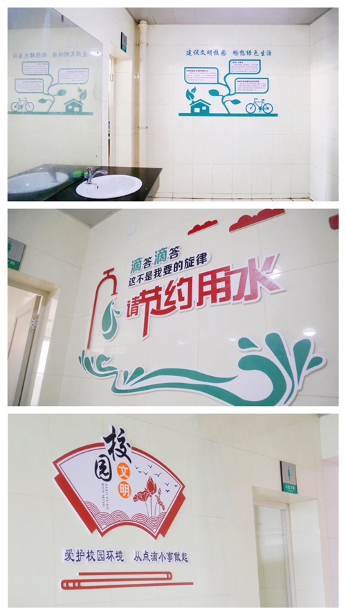 围绕“文明校园建设”主题,后勤保障中心从文明修养、责任意识、卫生清洁、节能低碳、爱护设施等方面考虑,在厕所墙面绘制了“点滴体现修养细节彰显文明”、“美在于营造 净在于创造”等主题标语,用无声的语言点滴浸润着师生们的心灵。在每个蹲位隔间张贴“向前一小步 文明一大步”、“若您如厕告成功 顺手冲水了不痕”等宣传挂画,活泼的文字配上俏皮的画面,十分惹人注目。在洗手间的墙面上,中心还分别以素雅古风、明快绿色为主题,将富有教育意义和时代气息的环保、节水等元素进行设计加工,制作成图文并茂的文化墙。这些含义丰富的“文明符号”生动地“映”在墙上,既为教学楼增添了一抹亮色,也为校园增添了浓郁的文化氛围。