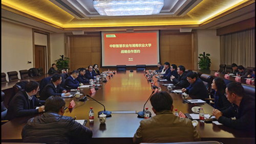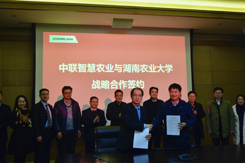 本网讯 (农学院 李绪梦)1月6日下午,学校与中联重科智慧农业公司校企战略合作签约仪式在中联重科麓谷工业园举行。副校长陈光辉,中联重科副总裁熊焰明出席签约会,农学院院长唐文帮与中联重科智慧农业公司常务副总裁袁勇富代表双方签订了校企战略合作协议和智慧农业项目合作协议。双方本着“优势互补、协同攻关、精诚合作、共创共建”的原则,在平台共创共建、技术协同攻关、项目协作申报、产学研基地共建等方面达成框架协议和具体项目合作协议。