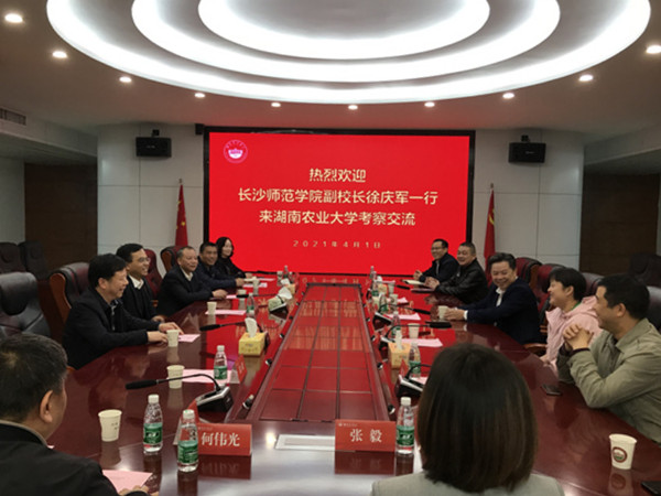 本网讯(体育学院 廖胜文)4月1日下午,长沙师范学院副校长徐庆军率教务处、学工处、体育科学学院等部门负责人来我校考察交流,学校党委书记陈弘、纪委书记凌生春,教务处、学工部、体育学院负责人接待了徐庆军一行,双方在文渊馆党委会议室进行了座谈和交流。