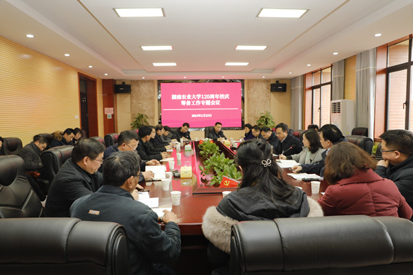 陈弘介绍了《120周年校庆筹备工作2022年度任务清单》,对下一阶段校庆筹备工作进行部署,并提出工作要求。根据筹备需要,学校将成立120周年校庆办公室,制作学校形象宣传片,开展校史文化资料整理编写与征文活动,开展校友走访联络、校友捐赠与文物收集,筹备建校120周年办学成果展览,建设袁隆平纪念馆,建设集校友成果展示、科技成果、营销平台于一体的湖南农产品集中展示平台,优化校园环境建设等。