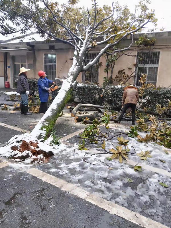 在巡查过程中,发现行政楼、中心广场等校园中心区域内有多处树木断枝,科教新村小区与第八教学楼、第十一教学楼之间各有一棵大树倒伏,将道路橫截,严重影响师生出行。绿化保洁部门立即响应,一边上报、一边组织工作人员对倒伏树木进行分解处理。由于倒伏的树木较大,给处置工作带来不小的挑战,但后勤绿化人不惧艰难、不畏严寒,冲锋在抗击冰雪前沿,雪夜里连续奋战5个多小时,直到凌晨2点多才将倒伏的树木和断枝败叶清理干净。