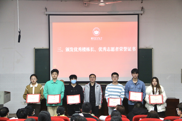 会上,学工部副部长夏棣稀作2021年工作小结和2022年工作部署,学工部部长翁波宣读《湖南农业大学2021年度学生宿舍管理优秀楼栋长、优秀志愿者名单》,吴波为全体获奖者颁发荣誉证书。