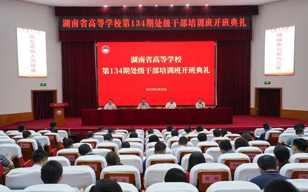 本网讯(宣传部 余婷婷)4月26日,湖南省高等学校第134期处级干部培训班在我校修业讲堂正式开班。湖南省委教育工委副书记、省教育厅党组成员、省委教育工委党校校长王建华,省高校干部培训中心主任、书记、省委教育工委党校常务副校长刘国华,学校纪委书记凌生春出席开班典礼。本期培训班全体学员参加,校党委委员、组织部部长兼党校常务副校长毛祥成主持。