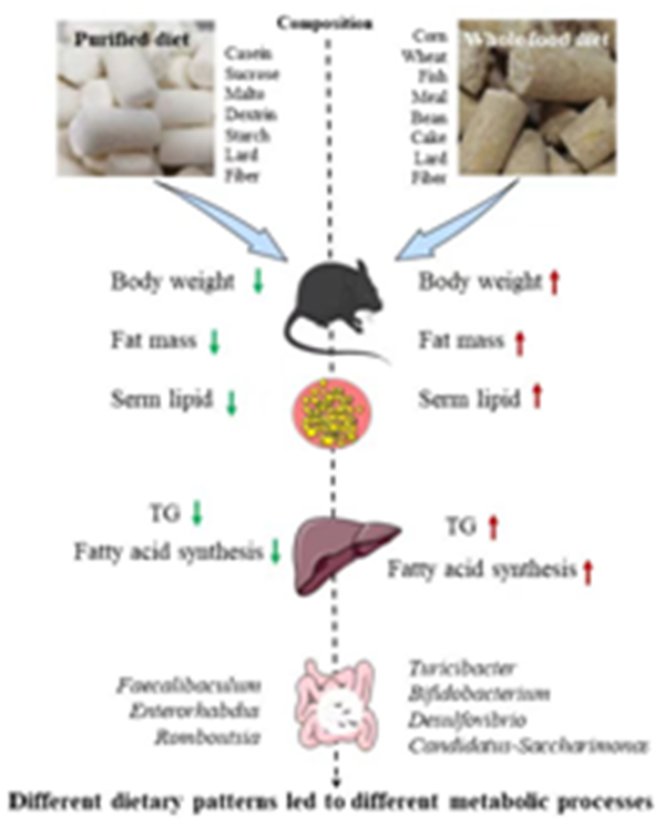 全食日粮(whole foods diet, WFD)是以玉米、小麦、鱼粉和豆饼等天然谷物和蛋白为原料,适量添加氨基酸和维生素等营养物质配制而成全价日粮,它的成份复杂,但与人类和杂食动物的膳食结构相同和相近;纯化日粮(purified diet)是以酪蛋白、蔗糖和糊精等纯化的营养素为原料,再添加纤维素和维生素等物质混合配制而成的成分清晰全价日粮。目前国际上开展糖脂代谢研究、探究饮食模式以及功能食品成份的研究,因纯化日粮便于对某一单一营养因素控制,绝大多数的生物学实验动物的日粮选择使用纯化日粮。本文通讯作者王吉博士等人前期开展糖脂代谢相关研究时发现,以全食日粮得到的试验结果和以纯化日粮重复得到的结果互相矛盾,故团队对以纯化日粮模拟代替全食日粮所得出的结论是否正确提出了质疑,团队成员张琳玉在硕士期间完成的硕士论文《全食与纯化日粮对小鼠糖脂质代谢的影响差异及其机理研究》进一步研究证实了这一发现。