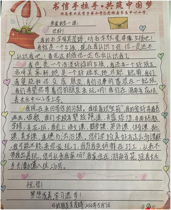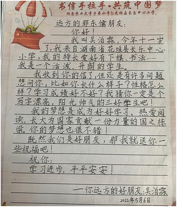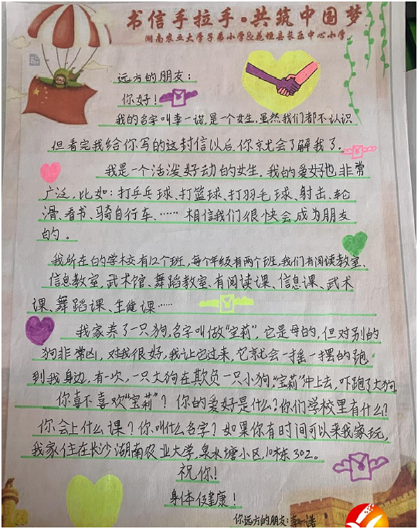 农大子校的孩子们在信中,不仅介绍了自己和所在班级的学习生活,还畅谈了自己的梦想,内容朴实而真挚。长乐中心小学的同学们也立即给长沙的小伙伴们书写回信,有的介绍起了花垣的历史文化与风景名胜;有的分享起了家乡美食与地方特色,热情欢迎长沙的同学们来做客;还有的推荐了最近读过的一本书,细细描绘起“未来中国与新时代的我们”。