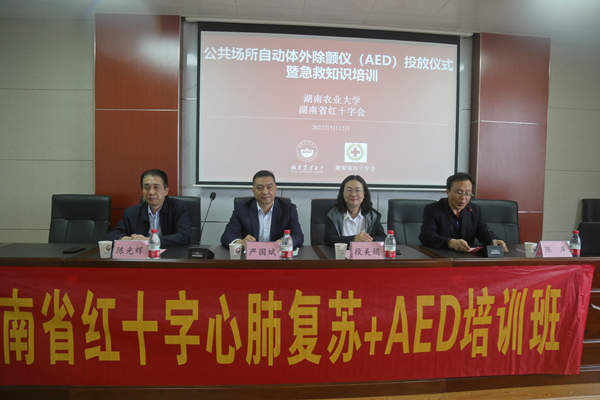 本网讯(后勤保障中心 蔡畅)5月12日是我国第14个防灾减灾日。当天下午,湖南省红十字会在我校举办自动体外除颤仪(AED)投放仪式暨急救知识培训活动。省红十字会党组成员、秘书长严国斌,省红十字会赈济救护部部长侯隽,赈济救护部四级调研员李海林,学校党委副书记段美娟,副校长陈光辉,校医院等相关部门负责人与工作人员,以及50多名学生参加活动。活动由后勤保障中心党委书记陈岸主持。