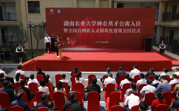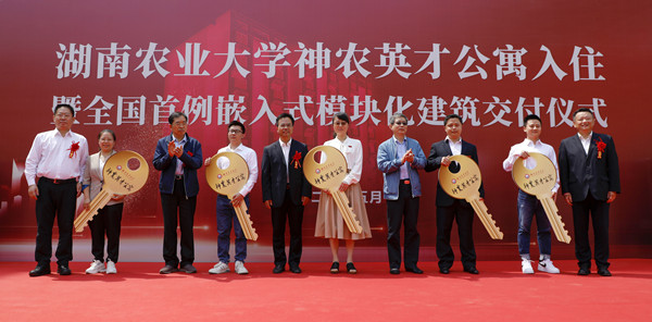 湖南省住建厅一级巡视员高东山,湖南建工集团党委委员、副总经理陈浩,校党委书记陈弘、校长邹学校出席,副校长兰勇主持神农英才公寓入住暨全国首例嵌入式模块化建筑交付仪式。湖南省住建厅、湖南建工集团、湖南华悦工程管理有限公司、天鉴国际工程管理有限公司相关领导与嘉宾,学校相关处室及学院负责人,首批入住青年英才代表参加仪式。