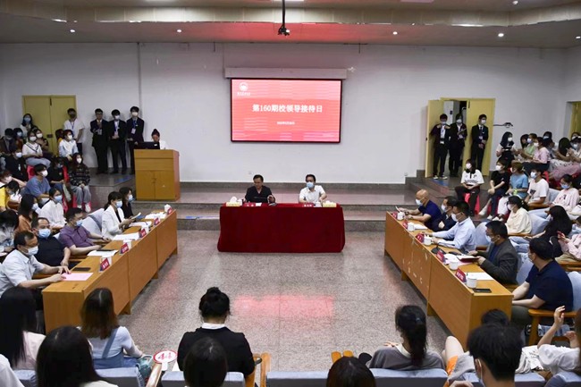 本网讯(校团委 贺佳 郁佳玺 赵陆源)5月26日晚,第160期校领导接待日在文渊馆一楼会议室举行。副校长吴波、陈光辉出席,党政办、学生工作部、保卫工作部、研究生工作部、教务处、团委、信息与网络中心、后勤保障中心、图书馆以及体育学院等单位负责人参加。