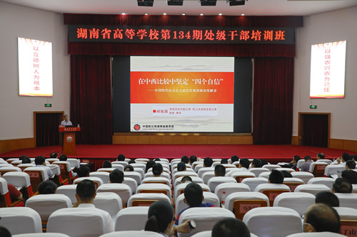 本网讯(学工部 朱佳)6月1日上午,十三届全国政协委员、湖南省政协副主席胡旭晟为湖南省高等学校第134期处级干部培训班讲授《在中西方比较中坚定“四个自信”——中国特色社会主义政治发展道路深度解读》,校党委委员、组织部部长毛祥成主持。