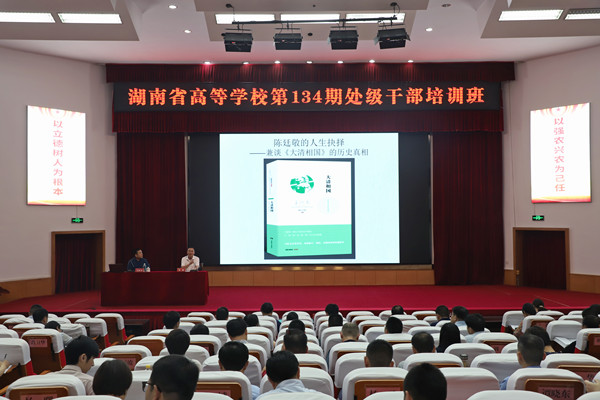 本网讯(宣传部 余婷婷)6月7日下午,中国作家协会主席团委员、湖南省作家协会主席王跃文以“陈廷敬的人生抉择——兼谈《大清相国》的历史真相”为主题,给湖南省高等学校第134期处级干部培训班授课,副校长吴波主持。