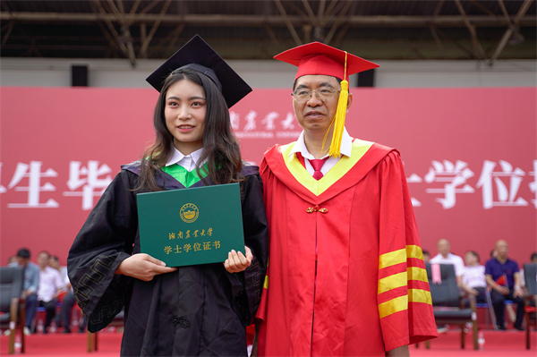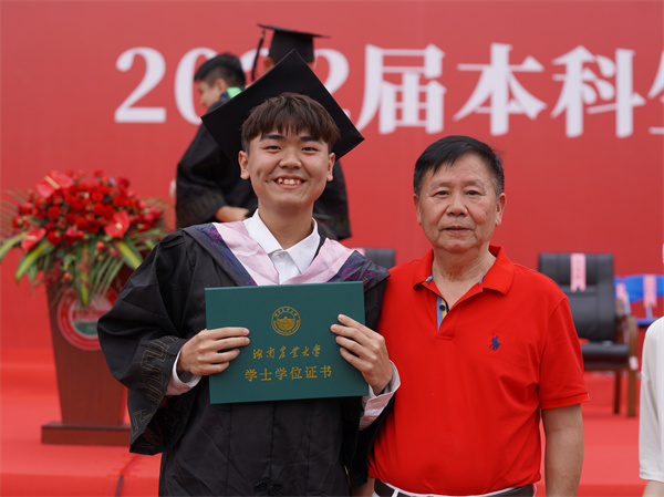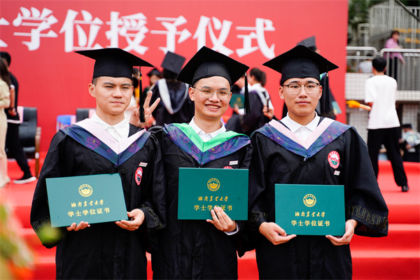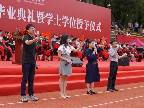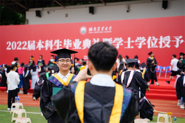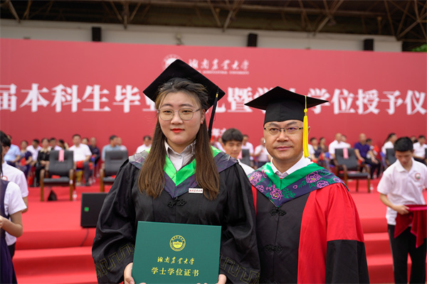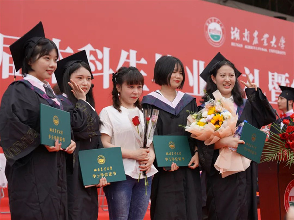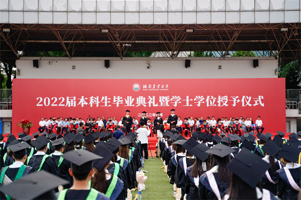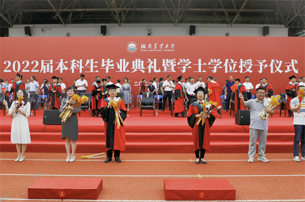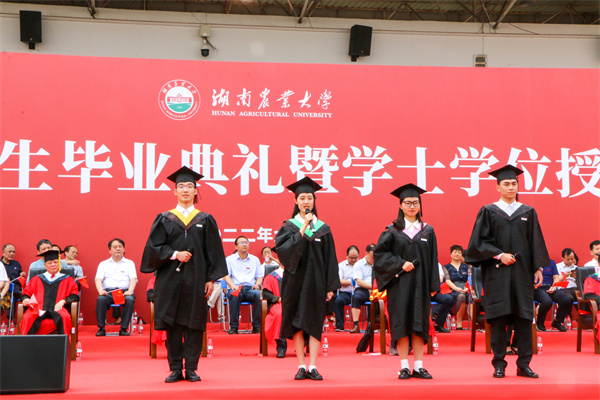 与会校领导和院士为2022届毕业生拨穗正冠,颁发学士学位证书,授予学士学位。毕业生代表杨雨昂、夏威、谢吉文、周倩茜分别深情回顾了在湘农的求学经历,表达了对母校的不舍和感激之情,并立志担当起强农兴农的社会责任和历史使命,将自身的发展融入国家和民族的发展之中,让青春在党和人民需要的地方绽放。