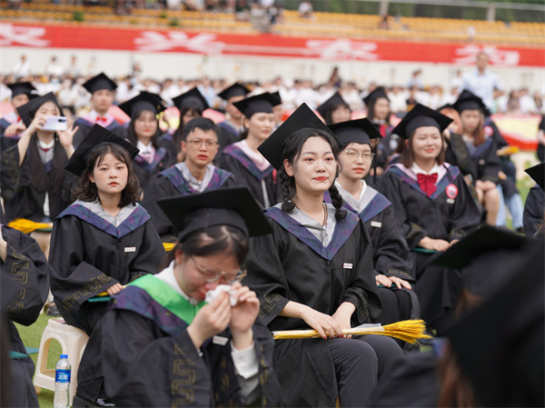 “问君此去几时还,来时莫徘徊……”段美娟、吴波以及各学院毕业生辅导员从现场各个位置“快闪”出现,瞬间点燃了典礼现场。《稻香》《陪你度过漫长岁月》《祝你一路顺风》《送别》《毕业歌》五首歌曲道出了师生们心底的此时此刻,全场师生们挥动着麦穗上演了一场千人大合唱,挥手拥抱、依依惜别,毕业典礼在汇聚着温暖和感动的歌声中结束。