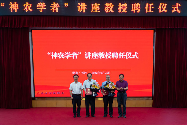 本网讯(机电工程学院 裴双成)6月25日下午,学校在修业讲堂举行仪式,聘任中国工程院院士罗锡文,中国工程院院士陈学庚为我校“神农学者”讲座教授。校党委书记陈弘主持仪式,中国工程院院士、校长邹学校出席,相关职能部门主要负责人以及机电工程学院师生代表参加。