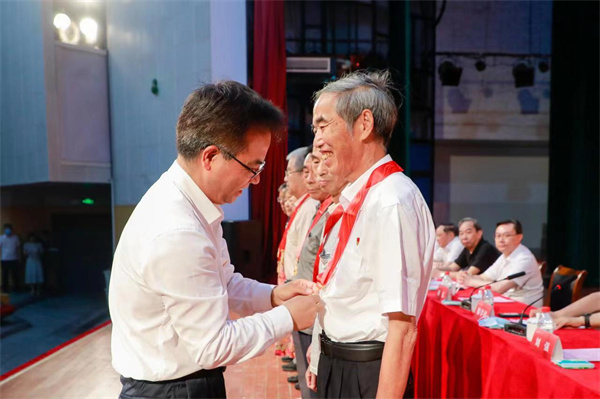 陈弘为获得“光荣在党50年”老党员代表发放纪念章 郭慧 摄