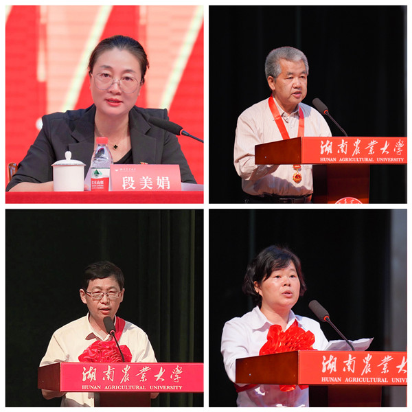 “光荣在党50年”纪念章获得者代表、原正校级督导吴立新,优秀教职工党员代表、农学院刘忠松教授,先进党支部代表、动物医学院教工第一党支部书记杨青教授分别作大会发言 。