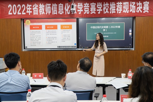 本网讯(教务处 黄佳宁)6月24日下午,我校2022年省普通高校教师信息化教学竞赛学校推荐现场决赛在十教学楼智慧教室举行。副校长方逵,湖南师范大学罗明、杨平展、长沙理工大学李晓铭、长沙师范学院马振中等校内外专家以及4名学生代表担任比赛评委,来自12个学院的15名教师参加比赛。各学院教师代表、教务处相关领导和工作人员现场观摩,200余人在线观看比赛。