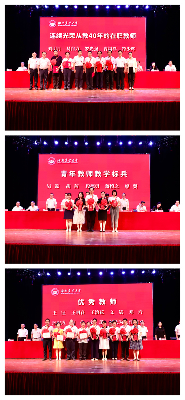 大会对湖南省第九届徐特立教育奖获得者、第18届霍英东教育基金会青年科技奖获得者、连续光荣从教40年的在职教师,以及2022年度校级青年教师教学标兵、优秀教师、优秀辅导员、优秀教育工作者进行了表彰。
