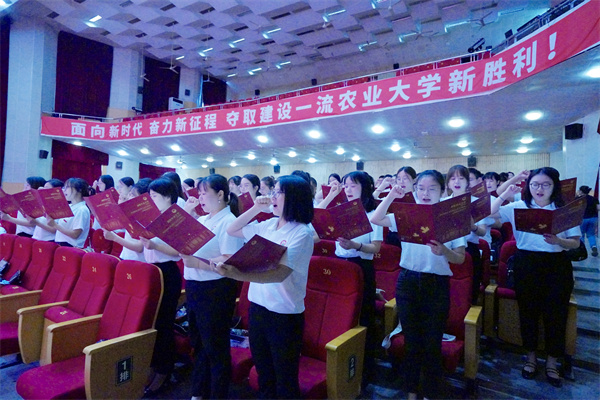 在新进教师入职仪式环节,与会校领导和院士为80余名2022年新进教师颁发了入职纪念牌。农学院高飞、资源环境学院龚盼代表新进教师作表态发言,大家集体宣誓:矢志做有理想信念、有道德情操、有扎实学识、有仁爱之心的“四有”好老师,为创建国内一流农业大学努力工作,为教育发展、国家繁荣、民族振兴奋斗终身!