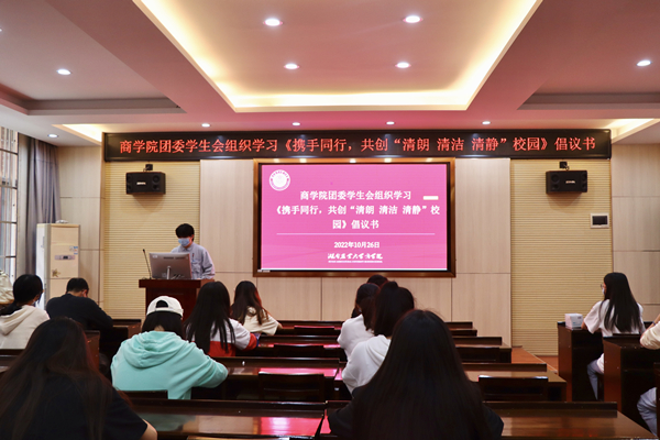 10月26日中午,校团委组织校、院两级主要学生干部代表在文渊馆开展了共创“三清”校园大讨论。与会学生积极发言,纷纷表示从自己做起、从身边做起、从小事做起,积极行动、自觉遵守、养成良好习惯,做清朗校园的营造者、清洁校园的守护者、清静校园的践行者,并承诺将充分发挥模范带头作用,结合部门工作,多形式多角度推进学校“三清”校园建设。会上,团委书记丁彦和学生干部代表一起在《携手同行,共创“清朗 清洁 清静”校园》倡议书上签字,向全体湘农学子发出郑重倡议。