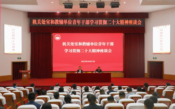 本网讯 (宣传部 庹炼)10月27日下午,学校举行机关处室和教辅单位青年干部学习贯彻党的二十大精神座谈会,校党委书记陈弘主持,中国工程院院士、校长邹学校,党委副书记段美娟,党委委员、组织部部长毛祥成,相关职能部门及学院负责人出席会议。