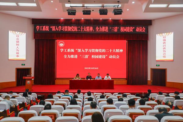 本网讯(党委学工部 朱逸飞)10月26日下午,学校学工系统在修业讲堂召开会议,对深入学习贯彻党的二十大精神,全力推进‘三清’校园建设进行动员部署。副校长吴波出席,党委宣传部、学生工作部、保卫工作部科级以上干部,各学院分管学生工作副书记,全体辅导员参会。党委学生工作部部长李姣主持。