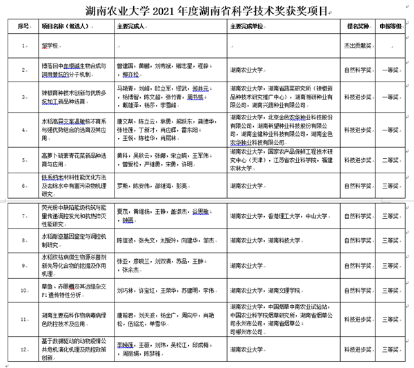 近年来,湖南农业大学科技创新坚持“四个面向”,坚持以国家重大战略需求为导向,主动融入湖南乡村振兴战略、“百千万”工程和千亿产业培育计划,立足湖南种质、科研和人才优势,充分发挥院士等领军人才的引领作用,建设跨学科、跨领域、全链条式的创新大团队,全面加强基础研究和应用研究,取得了一批有重要影响的基础研究和应用技术成果,为国家和区域、行业科技创新作出了积极贡献,为建设“质量卓越、优势突出、特色鲜明”的国内一流农业大学提供了强有力的科技支撑。