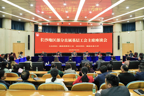 本网讯(校工会 杜智能)3月13日下午,长沙地区部分直属工会主席座谈会在生科楼国际会议厅召开,湖南省总工会党组成员、省教育工会主席候选人刘湘凌,省教育工会副主席候选人邓曼,校党委书记陈弘,校党委委员、副校长张立,长沙地区部分直属工会主要负责人出席,湖南省教育工会相关人员,学校各部门工会主席,校工会全体工作人员参加座谈。