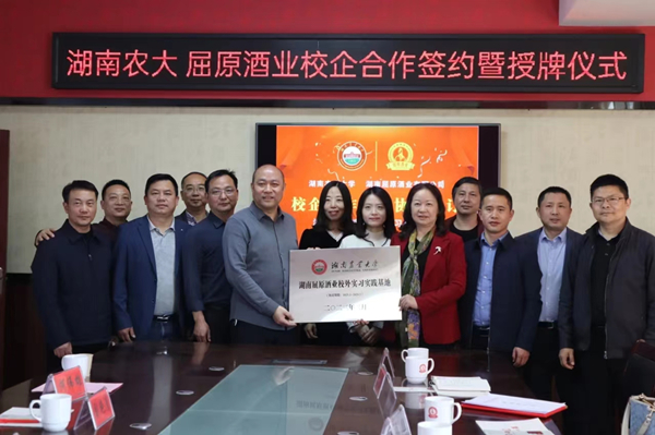 随后,与会人员围绕校企合作进行了广泛深入的交流。在与会人员的见证下,张立与湖南屈原酒业有限公司董事长何伟雄代表校企双方共同签订《湖南农业大学校外实习实践基地建设合作协议》和《设立湖南农业大学屈原酒奖学金协议》。现场进行基地授牌,并颁发捐赠证书。湖南屈原酒业有限公司将向湖南农业大学教育基金会捐赠9万元,面向湖南农业大学酿酒工程专业学生设立“湖南农业大学屈原酒奖学金”,用于奖励酿酒工程专业优秀学子。