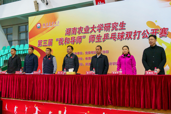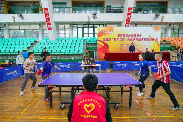 本网讯(研究生院、研究生工作部 杨穗冰 谌宇娟)3月19日,我校研究生第三届“我与导师”师生乒乓球双打公开赛在体育馆举行。本次比赛由研究生工作部主办,校党委书记陈弘出席开幕式并参加比赛,研究生院、党委研究生工作部,体育学院、风景园林与艺术设计学院负责人参加开幕式,各学院师生到现场为选手们加油。