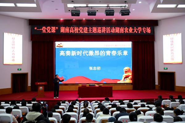 湖南省政府参事室特约研究员、省关心下一代工作委员会副主任张志初,湖南第一师范学院红色教育培训学院副院长、毛泽东与第一师范纪念馆副馆长张颖受邀授课,与湘农师生们一起回望历史、展望未来,现场座无虚席、掌声频频。