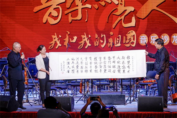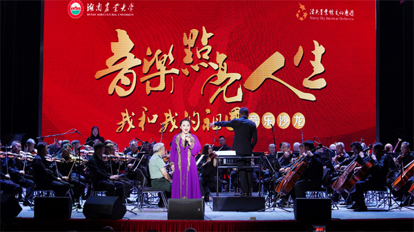 “惟楚有才斯为盛,农大欣逢双甲龄……”演出过程中,乐团团员国家一级导演、中国广播电视社会组织联合会电视剧导演委员会驻会副会长陈燕民为学校120周年校庆创作诗词一首,叶小文团长代表满天星业余交响乐团向学校赠诗,校党委委员、副校长张立代表学校接受赠送。