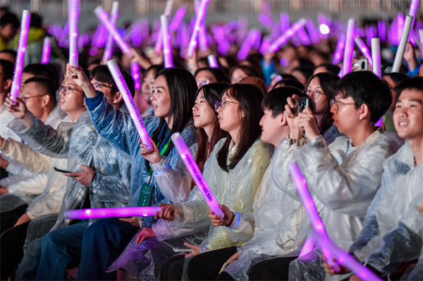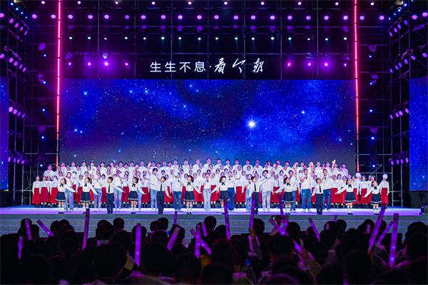 东田径场内灯光璀璨,欢动与祝福交织。舞蹈、歌曲、朗诵、情景剧等多种类型的节目精彩纷呈、轮番上演,舞美效果美轮美奂,青春之歌在校园中久久回荡,炫美色彩在校园上空绚丽绽放。