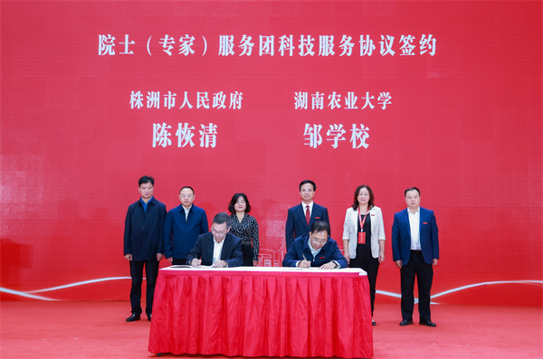 邹学校代表学校与株洲市人民政府签订《院士(专家)服务团科技服务框架协议》,根据协议,双方将在决策咨询、科研攻关、科技服务与人才支撑等方面进一步开展深层次、高规格的战略合作,相关重大项目将由湖南农大组建院士(专家)服务团对接开展科技服务,双方还将共建一批农业科技成果转化基地。