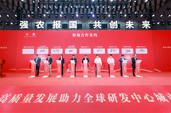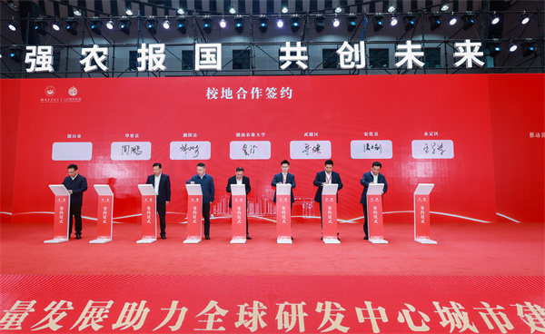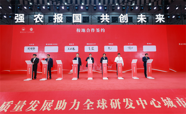 本网讯(宣传部 王薇薇 社会服务处 裴昌胜)10月8日,湖南农业大学在建校120周年之际,举行“推动县域经济高质量发展、助力全球研发中心城市建设”校地校企签约仪式,与省内外市(州)县人民政府、科研院所、知名领军企业等36家单位签订合作协议。校党委书记陈弘,校党委副书记、校长、中国工程院院士邹学校,校党委委员、副校长吴波、张立、兰勇,党委委员、组织部长毛祥成,学校相关部门和学院负责人、学生代表参加签约仪式,兰勇主持。