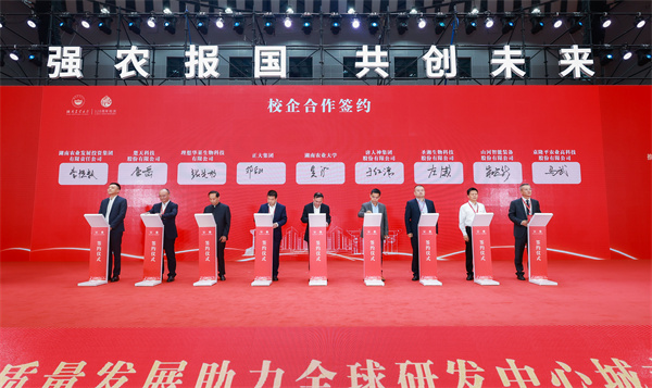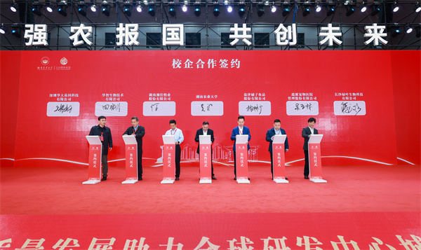 吴波代表学校与湖南省农业科学院、云南省德宏傣族景颇族自治州、江西省上犹县、云南省澜沧拉祜族自治县、广东省紫金县、福建省大田县、福建省安溪县、福建省武夷山市人民政府、韶山市、华容县、湘阴县、武陵区、安化县、永定区、宜章县、新晃侗族自治县、通道县、凤凰县、古丈县、保靖县;湖南农业发展投资集团有限责任公司、楚天科技股份有限公司、理想华莱生物科技有限公司、正大集团、唐人神集团、圣湘生物科技股份有限公司、山河智能装备股份有限公司、袁隆平农业高科技股份有限公司、深圳华大基因科技有限公司(湖南华大基因)、华智生物技术有限公司、湖南湘佳牧业股份有限公司、盐津铺子食品股份有限公司、瑞派宠物医院管理股份有限公司、长沙绿叶生物科技有限公司等34家省内外县(市区)人民政府、科研院所、知名领军企业签约。
