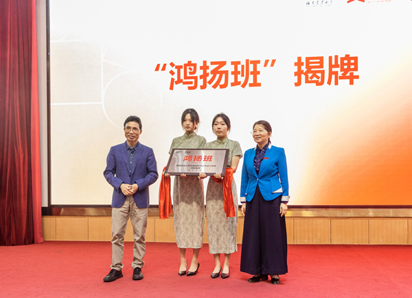 风景园林与艺术设计学院党委书记徐小雀与鸿扬集团董事长陈忠平共同为“鸿扬班”揭牌。双方将倾力办好“鸿扬班”,确保人才培养质量,持续推进产教融合,共同谱写协同育人的新篇章。