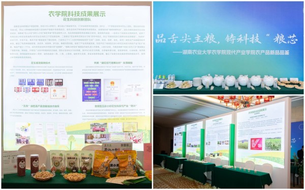 会议现场,刘忠松教授团队的《用油菜花铺就致富路》、刘建丰教授团队的《高异交率、多抗性优质温敏两系不育系呈391S的选育及应用》、肖应辉教授团队的《优质香型中稻两系不育系蒙香958S》、刘雄伦教授团队的《稻瘟病抗性改良为底盘,培育多抗优质高产水稻新品种》、邓化冰教授团队的《小粒型及高档优质香型水稻两用核不育系创制与应用》、雷东阳教授团队的《高档优质水稻新品种“华湘明珠”的选育与应用》、罗红兵教授团队的《玉米科技创新团队工作汇报》、李林教授团队的《湖南“五彩小籽”花生育种及栽培理论与技术创新》、刘春林教授团队的《特种油菜资源与作物病虫害防治颠覆性新方法》、揭雨成教授团队的《功能作物品种及特色产品生产关键技术》、张志飞教授团队的《紫花苜蓿高效栽培技术及多元草产品研发》、黎娟副教授团队的《深耕补碳长效机制研究》、周智教授团队的《作物生长环境与环境调控材料的开发应用》、吴俊教授团队的《一种作物广谱抗病新技术》共14支农学院专家团队围绕市场需求、研究背景、研究过程、研究成果特性、亮点以及应用前景等方面进行成果介绍,展示了各自最新研究进展和成果,并举办了“品舌尖主粮,铸科技‘粮芯’”农学院科技成果新品品鉴。稻米、菜籽油、花生、玉米等系列农产品深受在场企业和师生的喜爱。