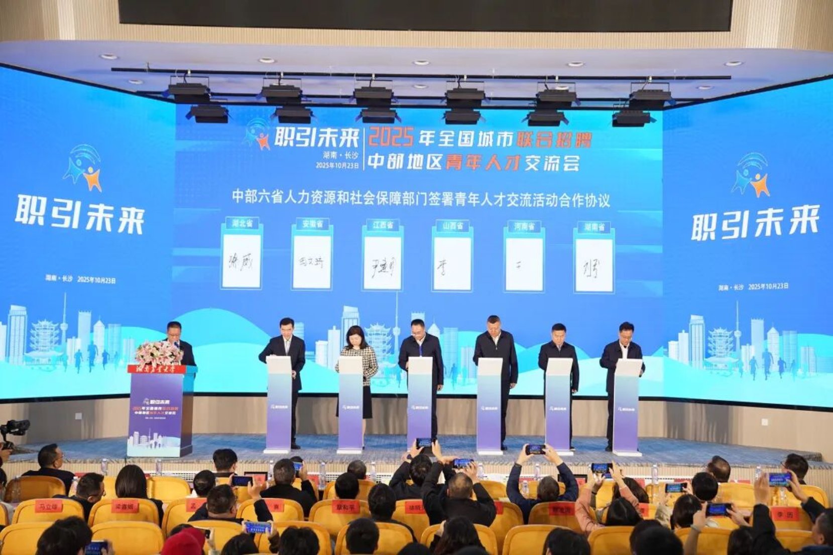 谢方平重点介绍了学校人才培养和就业服务保障情况。中部六省人社部门签署了人才合作协议,与会领导和企业代表深入招聘现场交流,考察我校就业驿站与创业孵化基地。