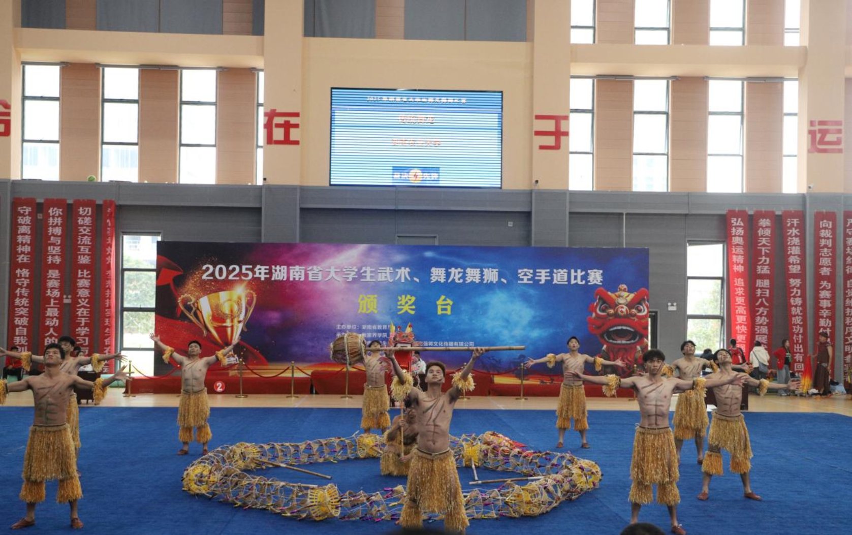 赛场上,湖南农业大学舞龙队的队员们手持金黄色的稻草龙,随着激昂的音乐腾挪跳跃,巨龙时而盘旋如惊雷乍起,时而低伏似稻浪翻滚,将农家丰收的喜悦融入每一个动作,展现出团队深厚的文化底蕴和扎实的基本功,赢得了现场观众的阵阵掌声和裁判的高度认可。