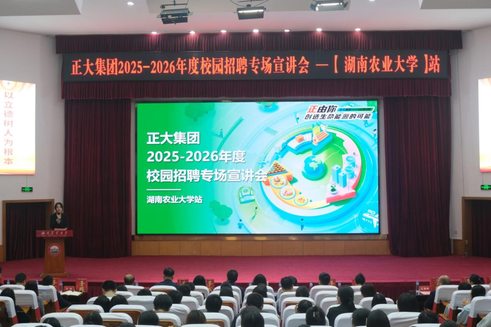 本网讯(动物科学技术学院谷康瑞)11月5日晚,正大集团2025—2026年度校园招聘湖南农业大学专场宣讲会在修业讲堂举行。校党委委员、副校长覃红燕,正大集团湖南区资深总裁邓红成、卜蜂莲花总裁宋华松、屠宰食品事业资深副总裁邹大友等企业代表,相关学院部分领导代表及近300名毕业生参加宣讲会。