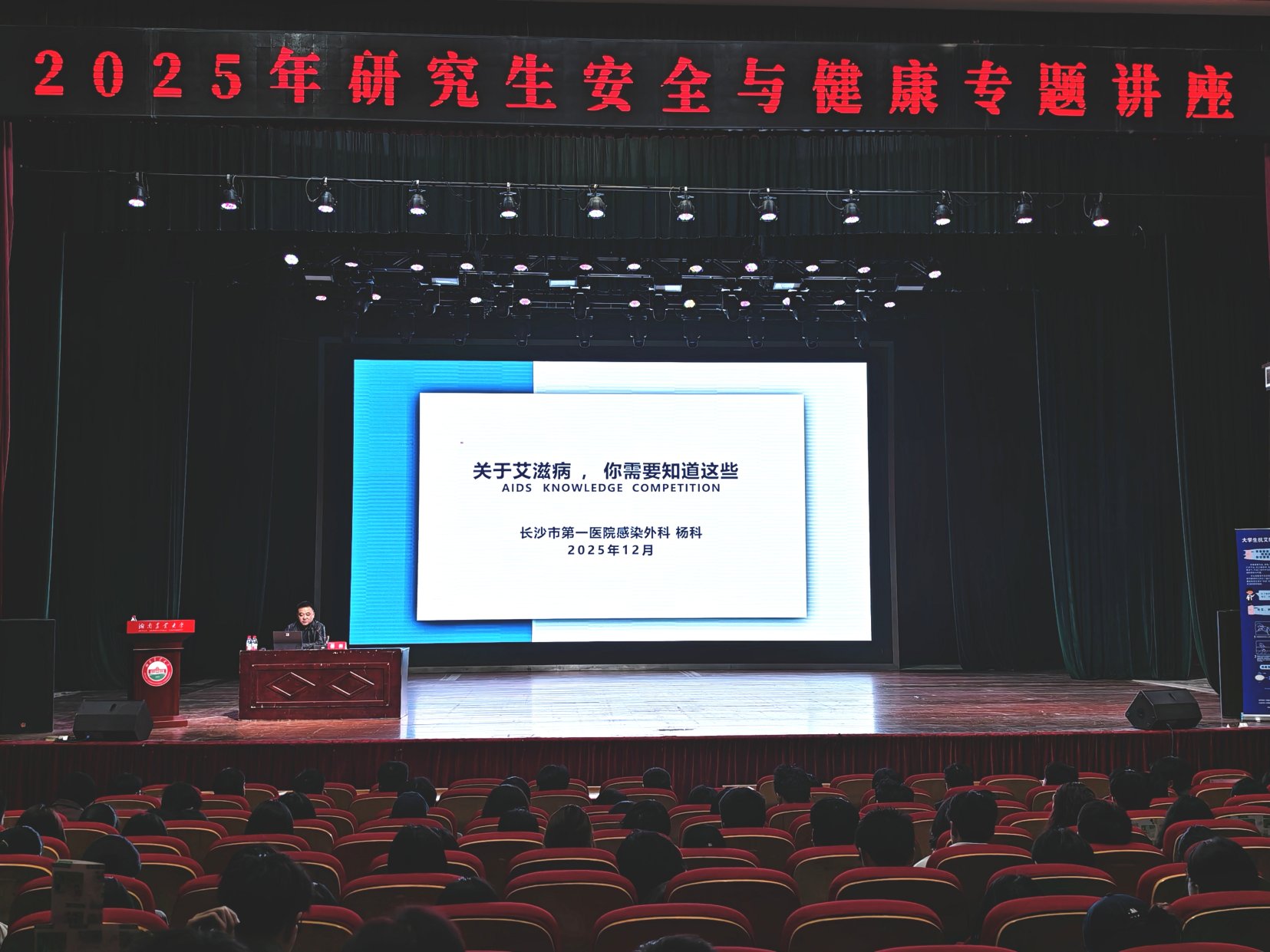 讲座邀请长沙市第一医院感染外科主任杨科医生担任主讲嘉宾。他以《关于艾滋病,你需要知道这些》为题,结合真实案例与最新权威数据,介绍了艾滋病的常见症状及防护措施,内容贴近学生实际,讲解深入浅出,兼具科学性与实用性。在互动环节,针对同学们提出的“感染HIV是否就等于患上艾滋病?”“蚊虫叮咬能否传播病毒?”“能否通过外表判断一个人是否感染?”等问题,杨科一一解答,用科学的解释破除常见误区,帮助大家树立正确观念,呼吁消除歧视、传递关怀。
