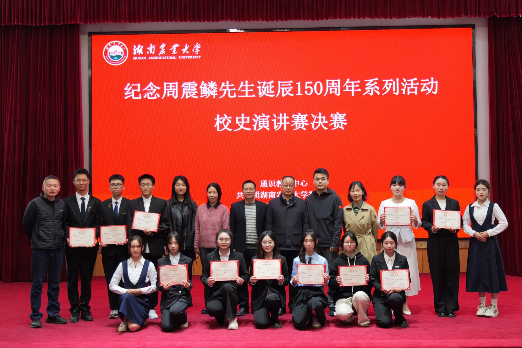 本届比赛由通识教育中心和校团委共同主办,经过学院初赛、学校复赛的层层选拔,12名选手晋级决赛。决赛现场,选手们以精妙的音乐搭配、凝练的文字表达和生动的史料呈现,深情讲述湘农故事。他们既回溯先辈艰苦创业的峥嵘岁月,也展现当代学子的奋进风采,现场反响热烈,大家纷纷表示,通过对周震鳞先生等湘农先贤的事迹深入挖掘与深情重温,进一步筑牢了知农爱农、学农为农的理想信念,未来将以更加饱满的热情珍惜在校时光,以实际行动为强国兴农事业贡献青春力量。