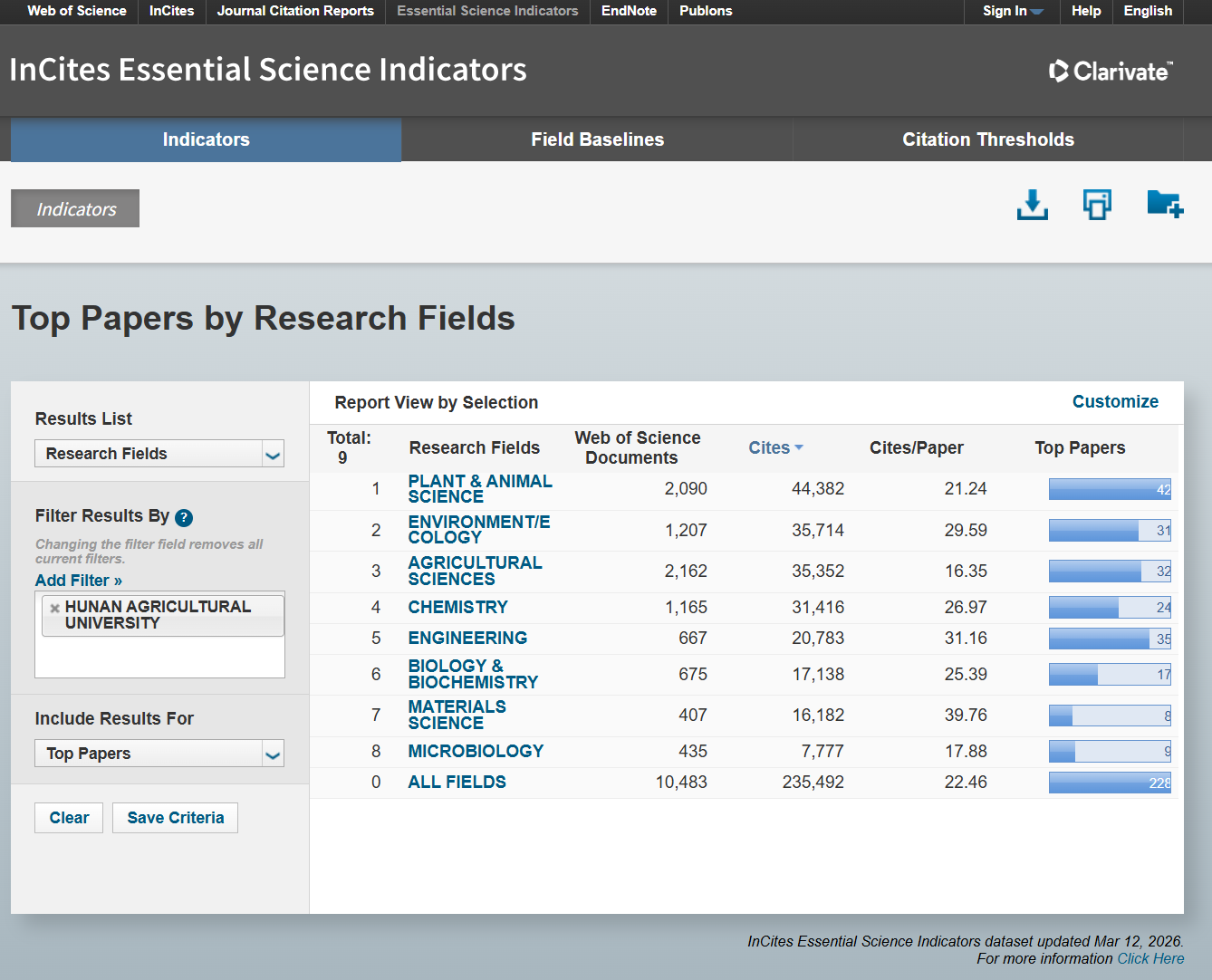 本次数据统计周期内,我校农业科学学科总被引数达到35352,环比增长2719次;篇均被引用16.35次,环比增长0.45次。在全球进入ESI前1%的该领域机构中,我校排名第146位,国内排名第29位。