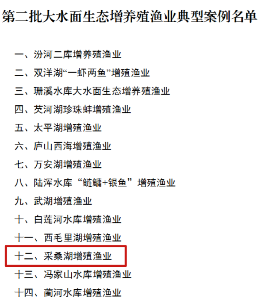 本网讯(水产学院 张健)近日,全国水产技术推广总站发布《关于推介第二批大水面生态增养殖渔业典型案例的通知》,公布了在全国范围内遴选14个有较强代表性和实践指导价值的大水面生态增养殖渔业典型案例。其中,由我校水产学院作为主要技术支撑单位的采桑湖增殖渔业案例成功入选。