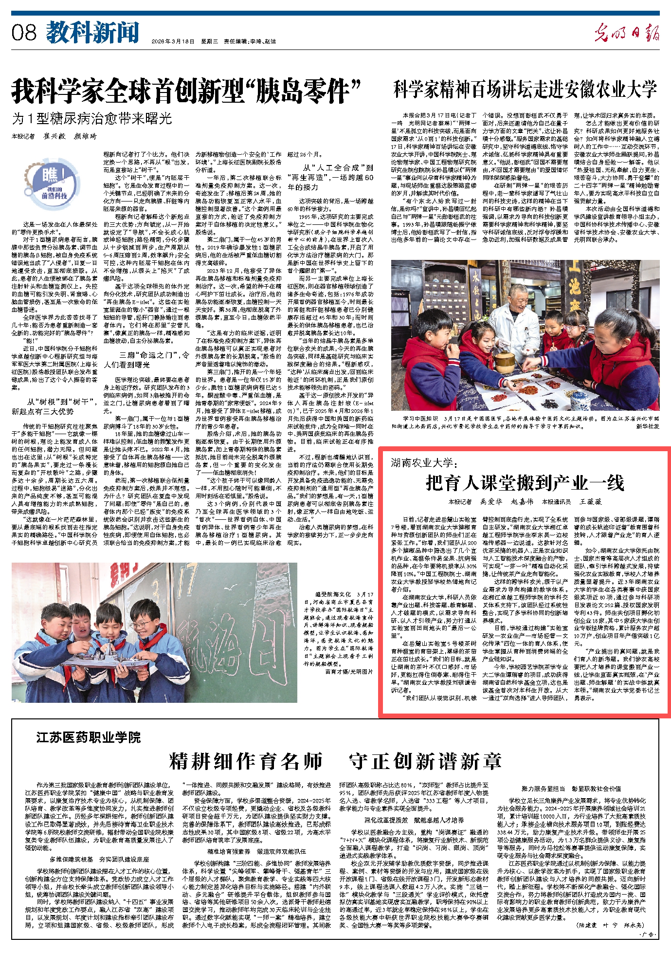 本网讯(宣传部)3月18日,《光明日报》以《湖南农业大学:把育人课堂搬到产业一线》为题,报道我校探索“产业出题、教科人一体答题”模式,构建“实验室研发—农业生产—市场经营—文化传承”四位一体的育人体系,以需求导向科研、以人才引领产业,努力打通从实验室到田间地头的“最后一公里”。
