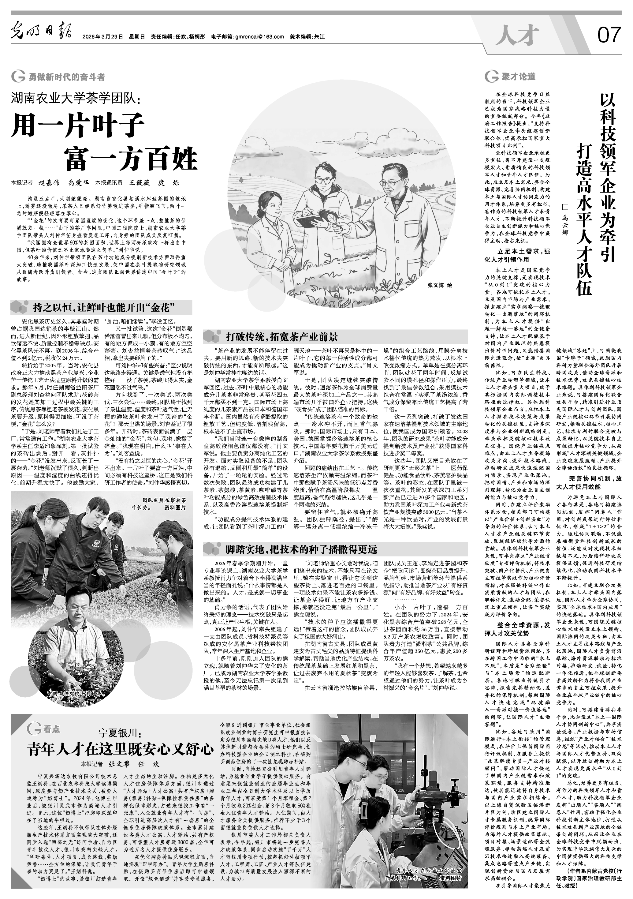 3月29日,《光明日报》人才版专版聚焦湖南农业大学茶学团队:用一片叶子 富一方百姓,带我们走进刘仲华院士团队“产业出题、团队解题、育人答题”的生动现场。